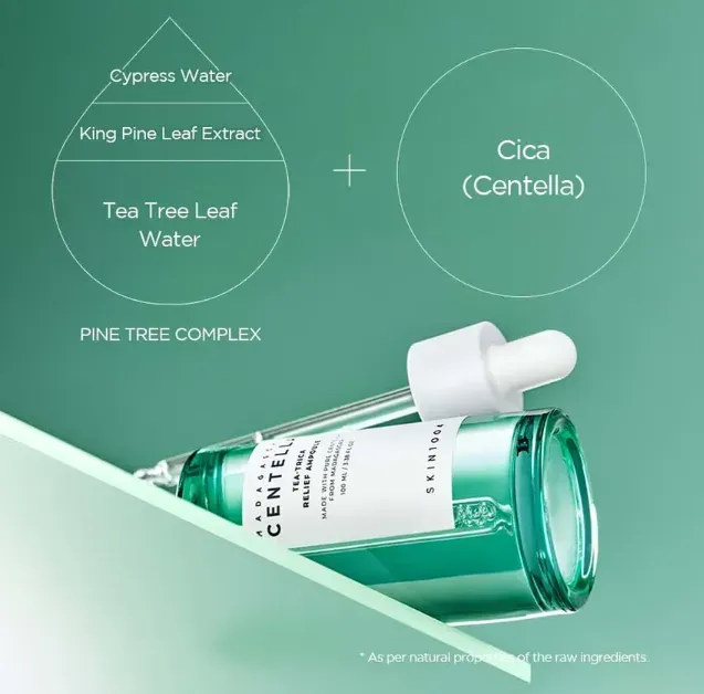 Contiene complejo de hojas de árbol de té (agua de hojas de árbol de té, extracto de pino de hoja larga y agua de ciprés) y extracto de centella asiática que alivia las molestias cutáneas.
